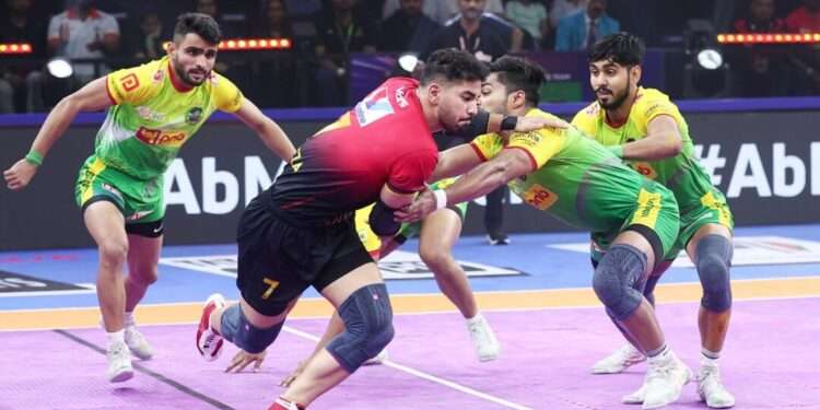 ವಿಶಾಖಪಟ್ಟಣಂ: ಪ್ರೊ ಕಬಡ್ಡಿ ಲೀಗ್ನ 12ನೇ ಆವೃತ್ತಿಯಲ್ಲಿ ಬೆಂಗಳೂರು ಬುಲ್ಸ್ ತಂಡವು ವಿಶಾಖಪಟ್ಟಣಂನ ವಿಶ್ವನಾಥ್ ಕ್ರೀಡಾ ಕ್ಲಬ್ನಲ್ಲಿ ಪಟ್ನಾ ಪೈರೇಟ್ಸ್ ವಿರುದ್ಧ 38-30 ಅಂಕಗಳ ರೋಮಾಂಚಕ ಗೆಲುವು ಸಾಧಿಸಿ ತನ್ನ ಖಾತೆ ತೆರೆಯಿತು. ಈ ಪಂದ್ಯದಲ್ಲಿ ಅಲಿರೇಜಾ ಮಿರ್ಜಾಯನ್ ತಮ್ಮ ಅದ್ಭುತ ಪ್ರದರ್ಶನದೊಂದಿಗೆ ಸೂಪರ್ 10 ಪೂರೈಸಿದರೆ, ಆಶಿಶ್ ಮಲಿಕ್ 8 ಅಂಕಗಳೊಂದಿಗೆ ಉತ್ತಮ ಸಾಥ್ ನೀಡಿದರು. ಈ ಗೆಲುವಿನೊಂದಿಗೆ ಬೆಂಗಳೂರು ಬುಲ್ಸ್ ತಂಡವು ತನ್ನ ಮೂರು ಸತತ ಸೋಲುಗಳ ಛಾಪು ಮರೆಯಿತು.