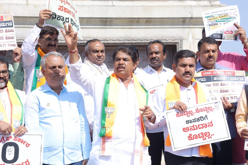 ಬಿಜೆಪಿ-ಜೆಡಿಎಸ್ ಪಕ್ಷಗಳ ಜನಪ್ರತಿನಿಧಿಗಳ ಪ್ರತಿಭಟನೆಯು ಇಂದು ವಿಧಾನಸೌಧದ ಗಾಂಧಿ ಪ್ರತಿಮೆ ಬಳಿ ನಡೆಯಿತು. ಈ ಸಂದರ್ಭದಲ್ಲಿ ಮಾತನಾಡಿದ ಅವರು, ದೆಹಲಿಗೆ ಹೋಗಿ ನಮ್ಮ ತೆರಿಗೆ ನಮ್ಮ ಹಕ್ಕು ಎಂದು ನಾಟಕ ಮಾಡುವುದಲ್ಲ; ಶಾಸಕರನ್ನು ಬೀದಿಗೆ ತಂದಿಟ್ಟಿದ್ದೀರಿ. ಈ ಬಾರಿಯಾದರೂ ಬಜೆಟ್ನಲ್ಲಿ ನಮ್ಮ ಕ್ಷೇತ್ರಗಳಿಗೆ ಅನುದಾನ ಕೊಡಿ ಎಂದು ಒತ್ತಾಯಿಸಿದರು.