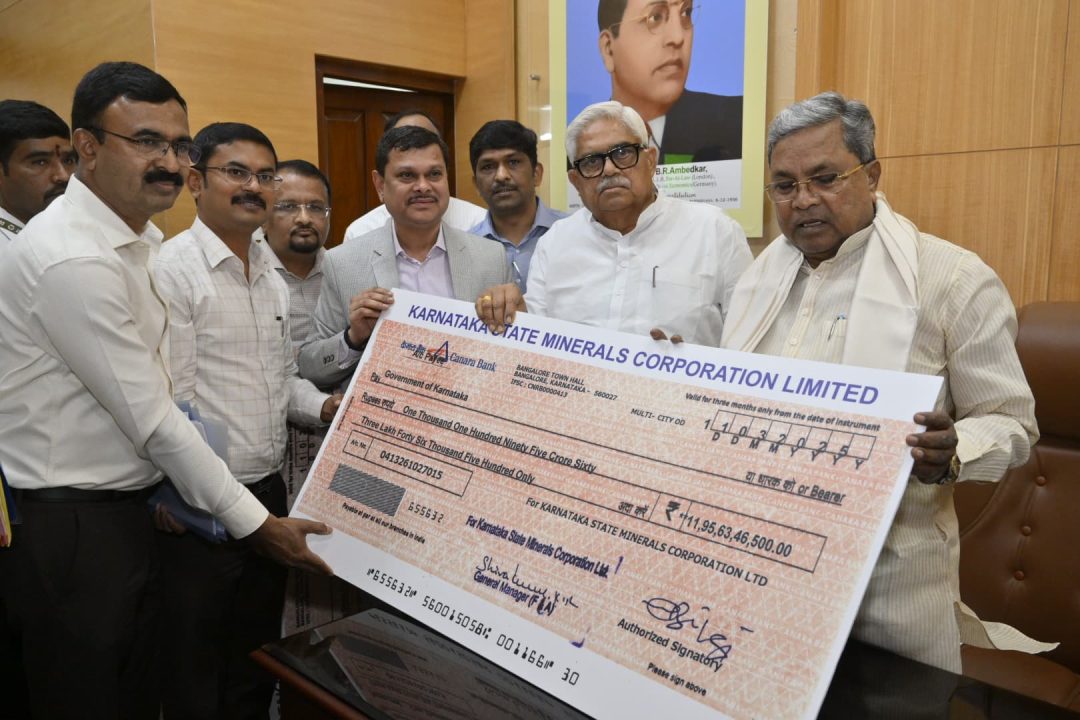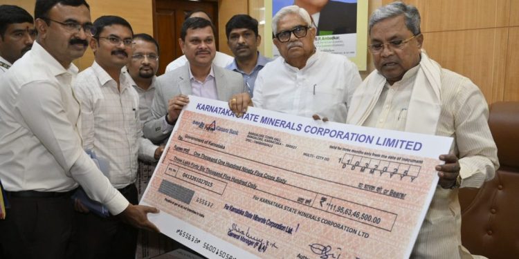 ಬೆಂಗಳೂರು: ಗಣಿಗಾರಿಕೆಯಲ್ಲಿ ತೊಡಗಿಸಿಕೊಂಡಿರುವ ಕರ್ನಾಟಕ ಸರ್ಕಾರದ ಮಾಲೀಕತ್ವದ ಸಾರ್ವಜನಿಕ ಉದ್ದಿಮೆ ಕರ್ನಾಟಕ ರಾಜ್ಯ ಖನಿಜ ಅಭಿವೃದ್ಧಿ ನಿಗಮವು ( ಈ ಹಿಂದೆ ಮೈಸೂರು ಮಿನರಲ್ಸ್ ಸಂಸ್ಥೆ) ರಾಜ್ಯ ಸರ್ಕಾರಕ್ಕೆ 1402 ಕೋಟಿ ರೂ.ಗಳ ಚೆಕ್ ಹಸ್ತಾಂತರಿಸಿತು.