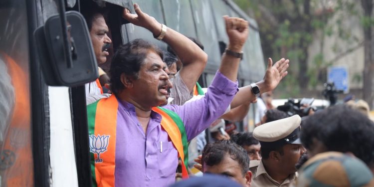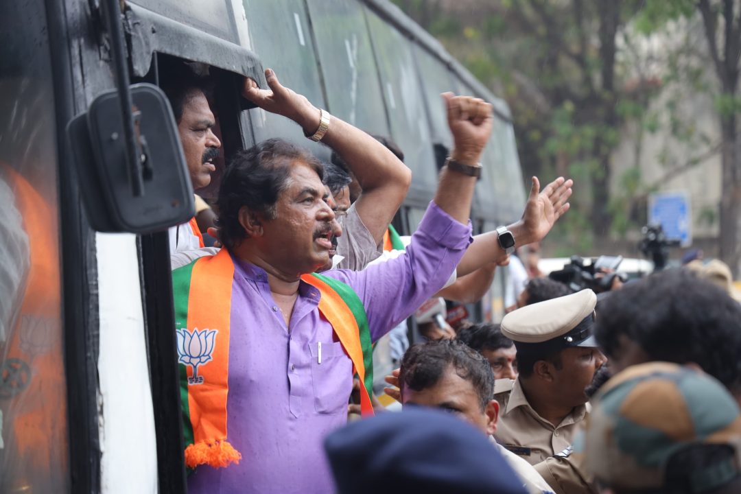 ಪ್ರತಿಭಟನೆ ಸಂದರ್ಭ ಬಿಜೆಪಿಯ ನಾಯಕರನ್ನು ಬಂಧಿಸಿ ಬಸ್ಗಳಲ್ಲಿ ಇರಿಸಲಾಗುತ್ತಿದೆ ಎಂಬುದರ ಬಗ್ಗೆ ಬೇಸರ ವ್ಯಕ್ತಪಡಿಸಿದ ಅವರು, “ಇಂದು ಸರ್ಕಾರ ಬಸ್ಗಳನ್ನು ತರಲೂ ಅಸಾಧ್ಯವಾಗುತ್ತಿದೆ. ಬಸ್ಗಳ ಕೊರತೆಯ ಮಧ್ಯೆ ಪ್ರತಿಭಟನಾಕಾರರನ್ನು ಕಟ್ಟಿ ಹಾಕಲು ಯೋಗ್ಯತೆ ಕೂಡ ಇಲ್ಲ” ಎಂದು ದೂರಿದರು.
