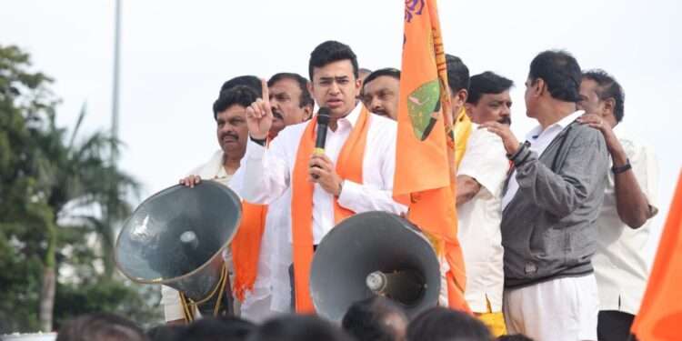 ಬೆಂಗಳೂರು: ನಾಡಿನ ಪ್ರಸಿದ್ಧ ಧಾರ್ಮಿಕ ಮತ್ತು ಶ್ರದ್ಧಾ ಕೇಂದ್ರವಾದ ಶ್ರೀ ಕ್ಷೇತ್ರ ಧರ್ಮಸ್ಥಳದ ವಿರುದ್ಧ ನಡೆಯುತ್ತಿರುವ ವ್ಯವಸ್ಥಿತ ಷಡ್ಯಂತ್ರ ಹಾಗೂ ಅಪಪ್ರಚಾರದ ವಿರುದ್ಧ ಧ್ವನಿಯೆತ್ತಲು ಬೆಂಗಳೂರು ದಕ್ಷಿಣ ಜಿಲ್ಲಾ ಬಿಜೆಪಿ ಘಟಕದ ವತಿಯಿಂದ ‘ಧರ್ಮರಕ್ಷಣೆಗಾಗಿ ಧರ್ಮಸ್ಥಳ ಯಾತ್ರೆ’ಯನ್ನು ಇಂದು ಆಯೋಜಿಸಲಾಗಿತ್ತು. ಈ ಯಾತ್ರೆಗೆ ಬಿಜೆಪಿ ಯುವನಾಯಕ ಹಾಗೂ ಸಂಸದ ತೇಜಸ್ವಿ ಸೂರ್ಯ ಅವರು ಚಾಲನೆ ನೀಡಿದರು.