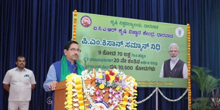 ಧಾರವಾಡ: ಕೇಂದ್ರ ಗ್ರಾಹಕ ವ್ಯವಹಾರಗಳು, ಆಹಾರ ಮತ್ತು ಸಾರ್ವಜನಿಕ ವಿತರಣೆ, ಹೊಸ ಮತ್ತು ನವೀಕರಿಸಬಹುದಾದ ಇಂಧನ ಸಚಿವ ಶ್ರೀ ಪ್ರಲ್ಹಾದ್ ಜೋಶಿ ಅವರು ಧಾರವಾಡದ ಕೃಷಿ ವಿಶ್ವವಿದ್ಯಾಲಯದ ಕೃಷಿ ವಿಜ್ಞಾನ ಕೇಂದ್ರದಲ್ಲಿ ಆಯೋಜಿಸಲಾದ ಪಿಎಂ ಕಿಸಾನ್ ಸಮ್ಮಾನ್ ನಿಧಿ ಯೋಜನೆಯ ಕಾರ್ಯಕ್ರಮದಲ್ಲಿ ಭಾಗವಹಿಸಿದರು. ಈ ಸಂದರ್ಭದಲ್ಲಿ 9 ಕೋಟಿ 70 ಲಕ್ಷ ರೈತರ ಖಾತೆಗೆ ₹20,500 ಕೋಟಿ ಮೊತ್ತವನ್ನು ವರ್ಗಾಯಿಸಲಾಯಿತು.
