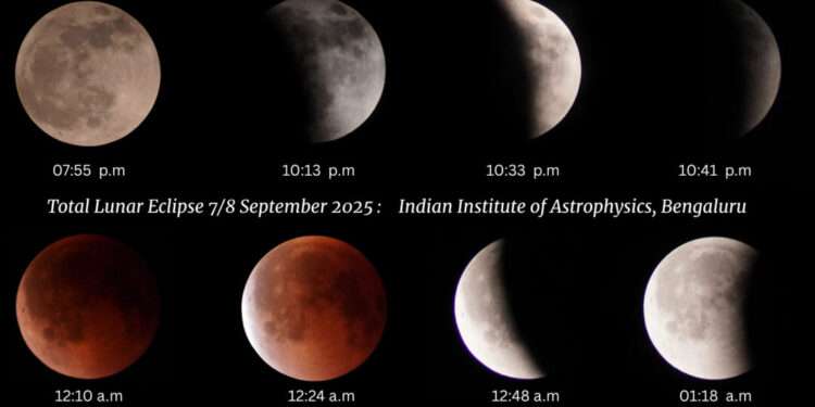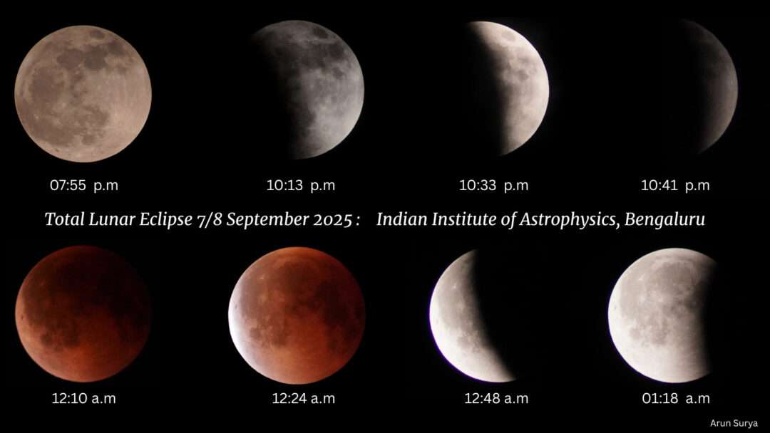 ಬೆಂಗಳೂರು: ಭಾರತೀಯ ಖಗೋಳ ಭೌತಶಾಸ್ತ್ರ ಸಂಸ್ಥೆ (IIA), ಬೆಂಗಳೂರಿನ ಕೊರಮಂಗಲದ ಪ್ರಧಾನ ಕಚೇರಿಯಿಂದ ಇಬ್ಬರು ಸಿಬ್ಬಂದಿ, ಡಾ. ಅರುಣ್ ಸೂರ್ಯ (ಅಧ್ಯಾಪಕ) ಮತ್ತು ಡಾ. ಪ್ರಸನ್ನ ದೇಶಮುಖ್ (ಎಂಜಿನಿಯರ್), ಚಂದ್ರಗ್ರಹಣದ ಅದ್ಭುತ ಛಾಯಾಚಿತ್ರ ಸರಣಿಯನ್ನು ಸೆರೆಹಿಡಿದಿದ್ದಾರೆ.