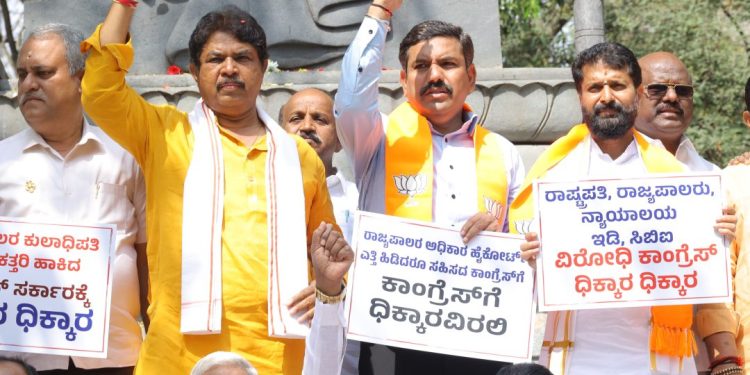 ಬೆಂಗಳೂರು: ರಾಜ್ಯಪಾಲರು ಹಾಗೂ ರಾಜಭವನಕ್ಕೆ ಅಪಮಾನ ಮಾಡಿದ ರಾಜ್ಯ ಸರ್ಕಾರದ ವಿರುದ್ಧ ಬಿಜೆಪಿ ಭಾರಿ ಪ್ರತಿಭಟನಾ ಪಾದಯಾತ್ರೆಯನ್ನು ಇಂದು ಆಯೋಜಿಸಿತು. ಈ ಪ್ರತಿಭಟನೆಯಲ್ಲಿ ಜೆಡಿಎಸ್ ಶಾಸಕರೂ ಭಾಗವಹಿಸಿದ್ದರು.