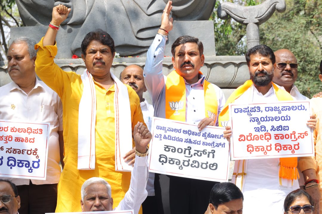 ಪ್ರತಿಭಟನೆಯಲ್ಲಿ “ರಾಜ್ಯಪಾಲರ ಅಧಿಕಾರವನ್ನು ಹೈಕೋರ್ಟ್ ಎತ್ತಿಹಿಡಿದರೂ ಸಹಿಸದ ಕಾಂಗ್ರೆಸ್ಗೆ ಧಿಕ್ಕಾರ”, “ರಾಜ್ಯಪಾಲರ ಕುಲಾಧಿಪತಿ ಸ್ಥಾನಕ್ಕೆ ಕತ್ತರಿ ಹಾಕಿದ ಕಾಂಗ್ರೆಸ್ ಸರ್ಕಾರಕ್ಕೆ ವಿರೋಧ”, “ರಾಜ್ಯಪಾಲರ ಸಾಂವಿಧಾನಿಕ ಹುದ್ದೆಗೆ ಕಳಂಕ ತಂದ ಮುಖ್ಯಮಂತ್ರಿ ಹಾಗೂ ಸರ್ಕಾರದ ವಿರುದ್ಧ ಹೋರಾಟ”, “ರಾಜ್ಯಪಾಲರ ಹೆಸರಲ್ಲಿ ರಾಜಕೀಯ ಮಾಡುತ್ತಿರುವ ಸರ್ಕಾರಕ್ಕೆ ತೀವ್ರ ವಿರೋಧ” ಎಂಬಂಥ ಸ್ಲೋಗನ್ಗಳೊಂದಿಗೆ ಬಿಜೆಪಿ ಶಾಸಕರು ಸರ್ಕಾರದ ವಿರುದ್ಧ ಆಕ್ರೋಶ ವ್ಯಕ್ತಪಡಿಸಿದರು.