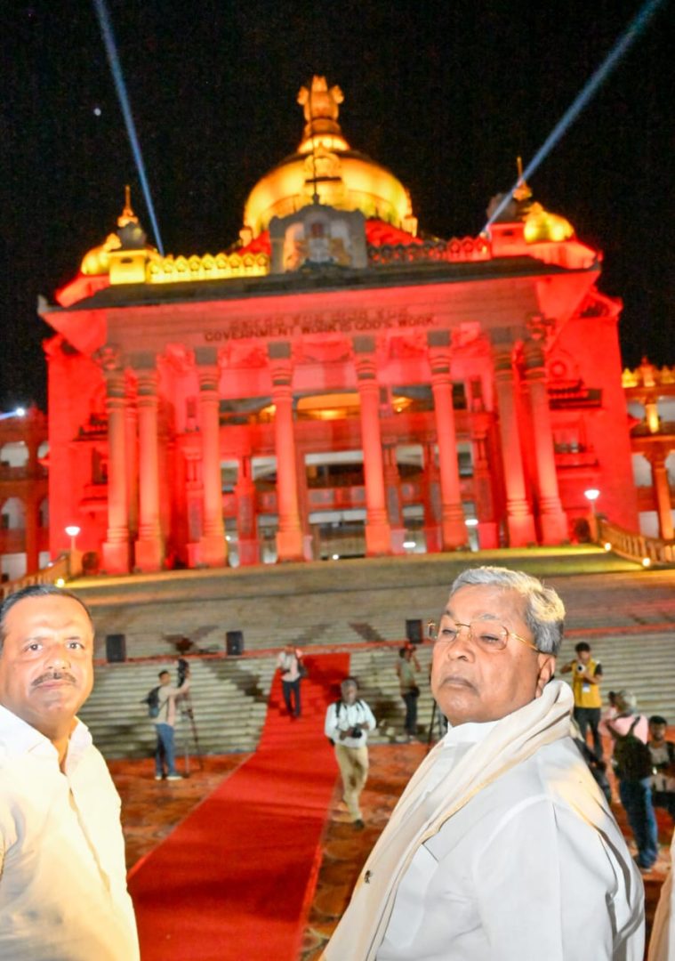 ಬೆಂಗಳೂರು: ರಾಜ್ಯ ರಾಜಧಾನಿಯ ಹೃದಯಭಾಗದಲ್ಲಿರುವ ವಿಧಾನ ಸೌಧದ ಶಾಶ್ವತ ವಿದ್ಯುತ್ ದೀಪಾಲಂಕಾರವನ್ನು ಮುಖ್ಯಮಂತ್ರಿ ಸಿದ್ದರಾಮಯ್ಯ ಅವರು ಭಾನುವಾರ ಸಂಜೆ ಭವ್ಯವಾಗಿ ಲೋಕಾರ್ಪಣೆಗೊಳಿಸಿದರು. ವಿಧಾನ ಸೌಧದ ಮೆಟ್ಟಿಲುಗಳಲ್ಲಿ ಏರ್ಪಡಿಸಿದ್ದ ವಿಶೇಷ ಸಮಾರಂಭದಲ್ಲಿ ಅವರು ದೀಪಾಲಂಕಾರವನ್ನು ಉದ್ಘಾಟಿಸಿದರು.